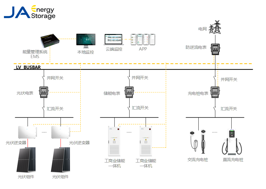 基于這一原則,在光儲充一體化方案中,晶澳采用以交流母線為核心的系統(tǒng)架構(gòu),將光伏、儲能與充電設(shè)施以標(biāo)準(zhǔn)并網(wǎng)設(shè)備形式接入。這一選擇背后,是長期工程實踐的綜合判斷: