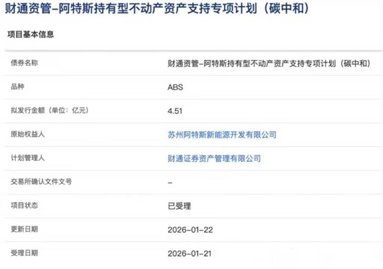 中國儲能網(wǎng)訊:2026年初,隨著“財通資管-阿特斯持有型不動產(chǎn)資產(chǎn)支持專項計劃(碳中和)”在上交所債券項目信息平臺正式獲受理,儲能行業(yè)迎來了一個標志性的資本事件。作為全市場首單儲能項目持有型不動產(chǎn)ABS,該產(chǎn)品的問世不僅意味著儲能資產(chǎn)成功叩開REITs的大門,更在4.51億元的融資背后,展現(xiàn)了行業(yè)估值邏輯的根本性重塑。