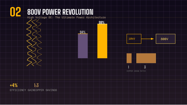 從經(jīng)濟(jì)性角度分析,直流化的推進(jìn)源于配電系統(tǒng)的成本優(yōu)勢(shì)與政策驅(qū)動(dòng)。根據(jù)行業(yè)白皮書(shū)數(shù)據(jù),一個(gè) 2.5 兆瓦系統(tǒng)采用直流 800V 與 380V 交流方案的用銅量比例約為 1:3,疊加大宗銅價(jià)持續(xù)上漲因素,經(jīng)濟(jì)性?xún)?yōu)勢(shì)愈發(fā)突出。需要強(qiáng)調(diào)的是,這 4 個(gè)百分點(diǎn)的效率提升絕非微不足道——對(duì)于一個(gè)百兆瓦級(jí)智算中心而言,這意味著每年可節(jié)省數(shù)千萬(wàn)元電費(fèi)支出,同時(shí)實(shí)現(xiàn)相應(yīng)的碳減排效益。