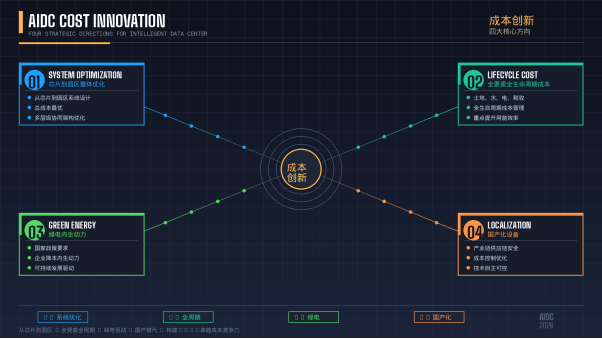 值得強(qiáng)調(diào)的是“卓越成本”理念而非“低成本”導(dǎo)向:在數(shù)據(jù)中心基礎(chǔ)設(shè)施建設(shè)中應(yīng)更注重性?xún)r(jià)比,而非單純追求低成本。換言之,在某些場(chǎng)景下,為提升可靠性、加快交付進(jìn)度和效率,適度的成本犧牲是合理的,因?yàn)槠鋷?lái)的性?xún)r(jià)比回報(bào)更高,成本創(chuàng)新可歸納為四個(gè)核心方向: