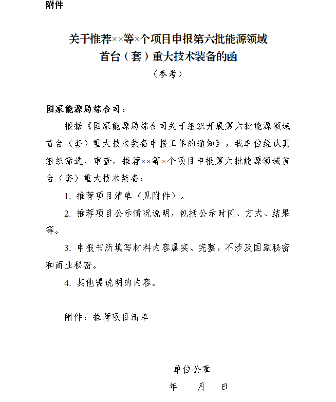附件:關于推薦××等×個項目申報第六批能源領域首臺(套)重大技術裝備的函(參考)