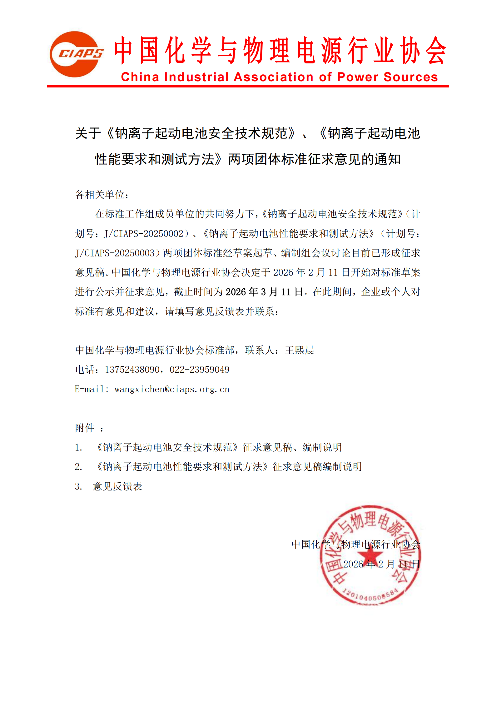 在標(biāo)準(zhǔn)工作組成員單位的共同努力下,《鈉離子起動(dòng)電池安全技術(shù)規(guī)范》(計(jì)劃號(hào):J/CIAPS-20250002)、《鈉離子起動(dòng)電池性能要求和測(cè)試方法》(計(jì)劃號(hào):J/CIAPS-20250003)兩項(xiàng)團(tuán)體標(biāo)準(zhǔn)經(jīng)草案起草、編制組會(huì)議討論目前已形成征求意見稿。中國化學(xué)與物理電源行業(yè)協(xié)會(huì)決定于2026年2月11日開始對(duì)標(biāo)準(zhǔn)草案進(jìn)行公示并征求意見,截止時(shí)間為2026年3月11日。在此期間,企業(yè)或個(gè)人對(duì)標(biāo)準(zhǔn)有意見和建議,請(qǐng)?zhí)顚懸庖姺答伇聿⒙?lián)系: