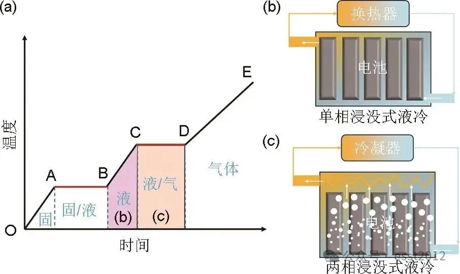 材料吸收熱量時會使自身溫度升高或發(fā)生相轉變,如[圖3(a)]所示:固態(tài)材料吸收熱量溫度升高(OA段);到達熔點時發(fā)生固-液相變(AB段);完全轉變?yōu)橐簯B(tài)后溫度繼續(xù)升高(BC段);到達沸點時發(fā)生液-氣相變(CD段);完全轉變?yōu)闅鈶B(tài)后溫度繼續(xù)升高(DE段)。相應的熱量在存儲過程中存在兩種形式:顯熱存儲(OA段、BC段和DE段)和潛熱存儲(AB段和CD段),且潛熱儲存量遠高于顯熱儲存。固-液相變由于相變潛熱大、相變前后體積變化小、過冷度低、化學性質穩(wěn)定和成本低廉等優(yōu)點常用作相變材料冷卻系統,也是鋰/鈉離子電池常見的熱管理系統之一。依靠材料的吸熱特性,液冷技術主要通過BC段和CD段液體作為冷卻液,吸收熱量實現電池組溫度的降低。根據冷卻液在散熱過程中是否發(fā)生液-氣相變,浸沒式液冷技術可分為單相浸沒式液冷和兩相浸沒式液冷,這兩種系統在工作原理和應用場景等方面存在一定的差異,表1中直觀地對比了兩種浸沒式液冷技術。