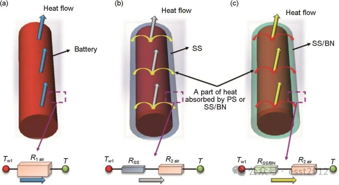 圖4 電池的不同散熱模式:(a)空氣冷卻模式;(b)純SS冷卻模式和(c) SS/BN冷卻模式