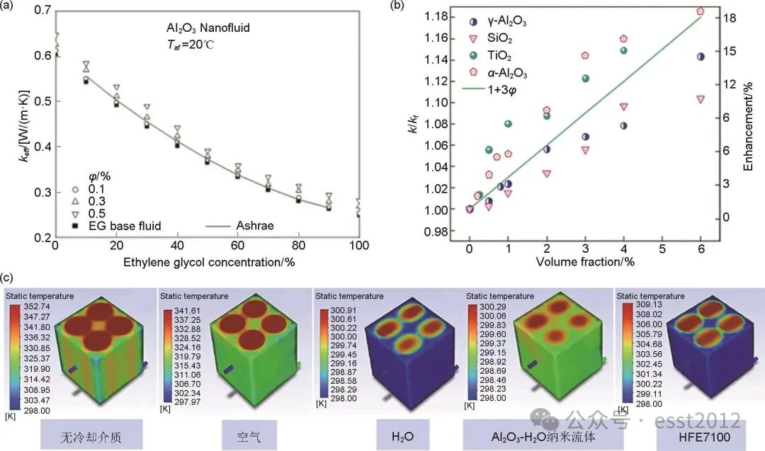 納米流體是指金屬或非金屬納米粉分散到水、醇和油等傳統換熱介質中,制備成均勻、穩(wěn)定和高導熱的新型換熱介質。在電池熱管理領域,Cu、Al、CuO、Al2O3、TiO2、SiO2、CNTs等納米顆粒常添加到水和醇混合溶液中,以提高冷卻液的導熱系數。Zakaria等研究了在乙二醇和水混合溶液中添加Al2O3對其熱導率的影響。結果表明乙二醇和水混合溶液的熱導率會隨著乙二醇含量的增加而降低[圖5(a)];然而,對于特定的乙二醇和水混合溶液(50∶50,體積比),當Al2O3納米顆粒的體積分數分別為0.1%、0.3%和0.5%時,熱導率分別提升約2%、4.2%和7.5%。Das研究了普通納米流體和混合納米流體的熱導率,發(fā)現混合納米流體熱導率是納米顆粒體積分數的增函數。即當Al2O3、TiO2和SiO2的添加量(φ)在0~6%之間時,混合納米流體的熱導率提升量可以用1+3φ來近似表示[圖5(b)]。Kumar等人開發(fā)了電池熱管理系統(BTMS)的三維計算流體動力學(CFD)模型,該模型包含2×2排列的圓柱形鋰離子電池。該BTMS的CFD使用空氣、水、Al2O3-水納米流體和HFE7100四種冷卻介質進行模擬。設置所有冷卻劑的入口溫度為298K,風冷、水冷、納米流體和HFE7100電池組在5 C放電速率下最高溫度分別為341.61、300.91、300.29和309.13K[圖5(c)],表明水和Al2O3-水納米流體是高倍率運行時BTMS的最佳冷卻劑,而空氣冷卻會導致電池組熱失控。