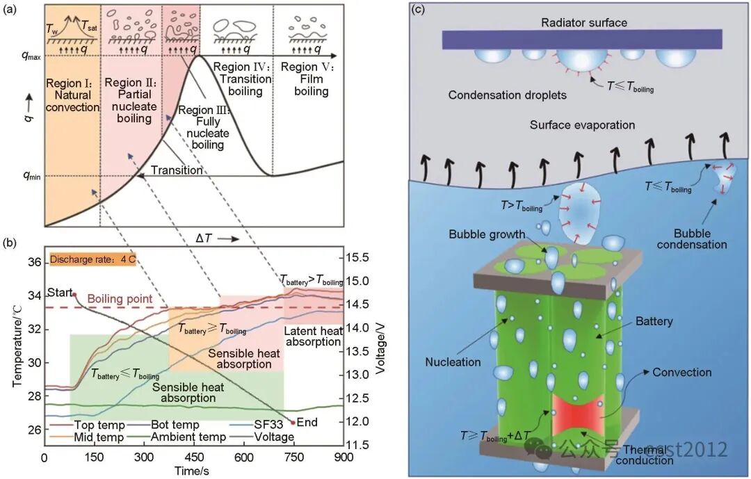圖6 (a) 沸騰曲線;(b) 4 C放電時的溫度演變過程以及 (c) 沸騰傳熱行為的示意圖