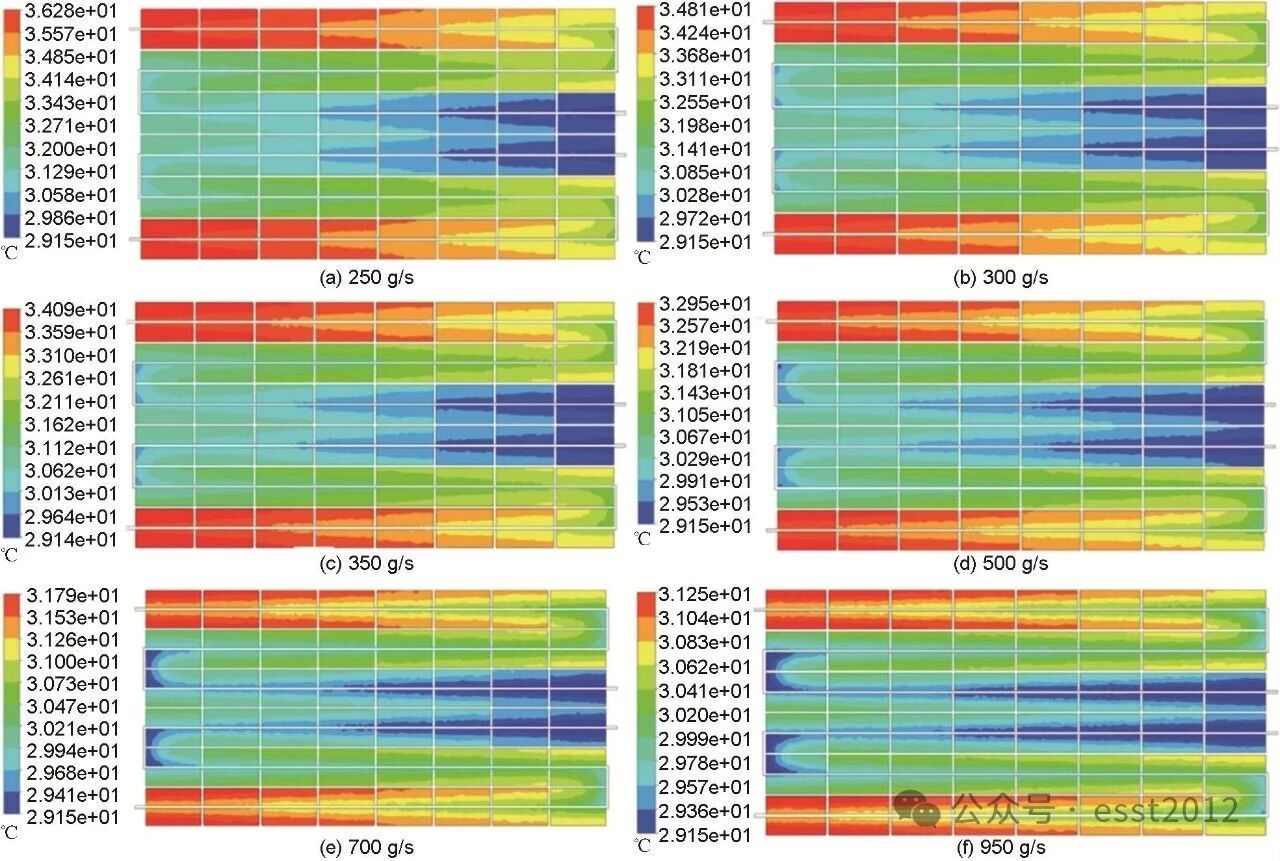 圖7 不同入口流量下電池組的溫度分布: (a) 250 g/s;(b) 300 g/s;(c) 350 g/s;(d) 500 g/s;(e) 700 g/s;(f) 950 g/s