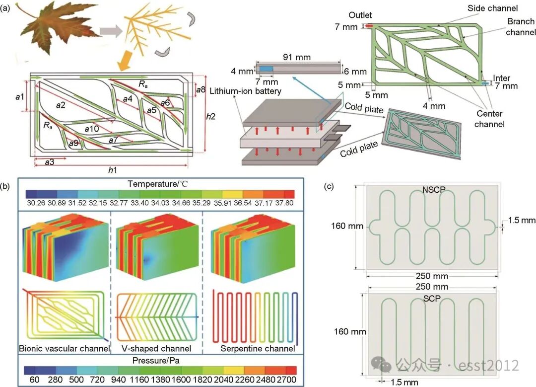 圖8 (a) 葉形通道結構的BTMS;(b) 具有不同流道結構的電池模塊的溫度和流道壓力圖;(c) NSCP和SCP液冷板流道示意圖