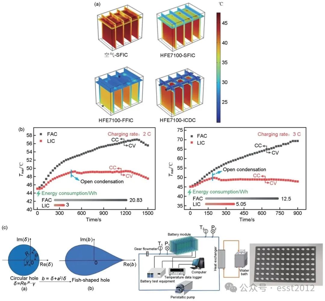 浸沒式液冷是現今最具應用前景的電池熱管理技術,多項研究通過對比和仿真一致證明,浸沒式液冷在降溫效果和穩(wěn)定均勻性方面顯著優(yōu)于傳統的空氣冷卻。Tian等對比研究了空氣冷卻、HFE7100靜流浸沒式冷卻(SFIC)、強制流浸沒式冷卻(FFIC)和浸入耦合直接冷卻(ICDC)的性能。結果表明,與自然對流條件相比,SFIC、FFIC和ICDC的最高溫度分別降低了4.23%、5.70%和13.29%[圖9(a)]。FFIC模式對冷卻液的流動參數具有最高的敏感性,調控冷卻液的流速可以提高冷卻液熱導率和比熱容,降低電池模塊的最高溫度。Koster等對比研究了空氣冷卻和新型浸沒式冷卻系統對18650電池組的冷卻性能影響。發(fā)現浸沒冷卻電池組中最大溫差為1.5℃,遠低于風冷(15℃),在600次循環(huán)后浸沒式液冷電池組的容量保持率提高了3.3%。Wu等建立了60節(jié)浸沒式液冷電池組的三維模型,仿真結果表明在2 C放電倍率下采用0.2 L/min的低流量下電池組最高溫度為34.22℃,內部沒有出現局部異常過熱現象,隨著冷卻液流量的增加,電池組內的溫度均勻性得到明顯改善,建議保持流量高于0.5 L/min以確保電池溫差低于5℃。Li等提出并測試了一種基于FS49的新型BTMS用于在快速充電條件下圓柱形鋰離子電池的液冷模塊。比較了強制風冷(FAC)和液體浸沒式冷卻(LIC)下電池模塊在2 C和3 C倍率充電下的溫度響應。結果表明LIC模塊比FAC在2 C和3 C倍率充電時的峰值溫度分別降低7.7℃和19.6℃[圖9(b)],而LIC相應的冷卻能量和消耗量僅為FAC的14.41%和40.37%,同時LIC下電池組具有更好的溫度均勻性。Gao等提出了一種基于共形映射技術和仿生學原理設計的帶有魚形孔導流結構的浸沒式液冷電池冷卻系統[LIBCS,圖9(c)]。與不使用導流器的情況相比,3 C放電倍率的鋰離子電池使用普通導流器的LIBCS在質量流量為0.00273 kg/s時,電池最高溫度降低了5.3%,但泵功耗增加了81.4%,而使用帶有圓形孔和魚形孔的導流件可將最高LIB溫度分別降低9.2%和12.2%,同時將最大溫差保持在5℃以內。此外,在相同工況下采用魚形孔導流器的LIBCS與普通導流器和圓孔導流器相比,泵功耗分別降低了42.1%和11.8%,在質量流量為0.00273 kg/s時,使用魚形孔導流器的LIBCS綜合性能因子比不使用導流器、普通導流器和帶有圓孔的導流件的情況分別提高了24%、39.3%和7.3%,在實際工程中具有更大的應用價值。上述研究揭示了浸沒式液冷技術的性能優(yōu)化方向:一方面,提高冷卻液流速能有效提升散熱能力并改善溫度均勻性;另一方面,在流道結構上進行創(chuàng)新設計是提升能效的關鍵。