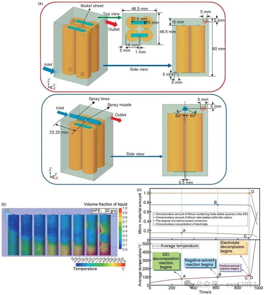圖10 (a) 噴淋浸沒式液冷示意圖;(b) HFE液滴在電池模塊中的運動軌跡和分散情況;(c) 模擬電池過熱階段的溫度變化