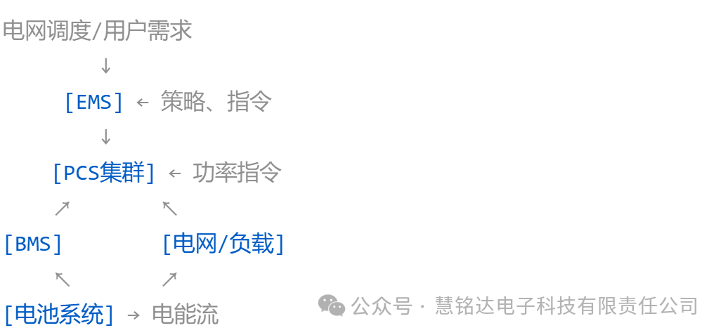 1. 能量流系統(tǒng)(電力實(shí)體層)這是完成電能存儲(chǔ)與釋放的物理實(shí)體,核心路徑為:電網(wǎng)/負(fù)載? PCS ?電池簇。