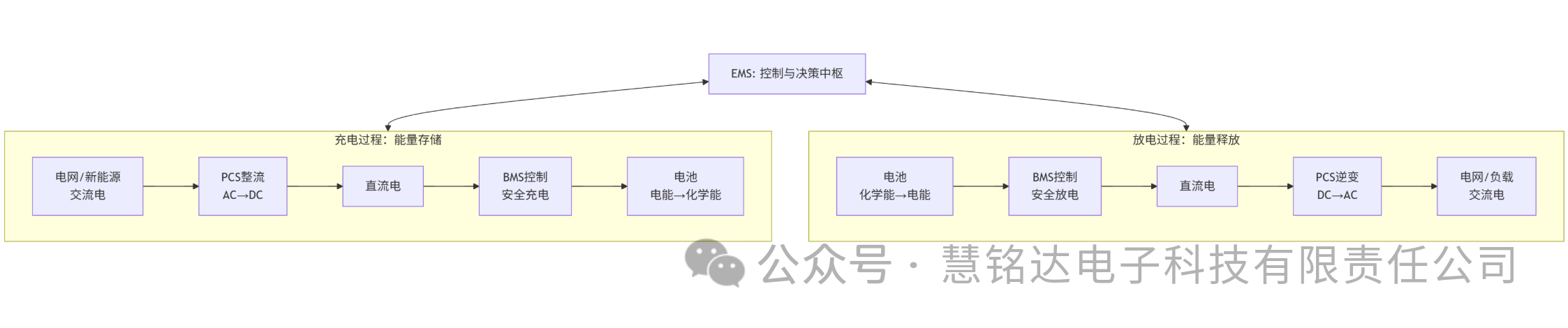 電網(wǎng)或新能源發(fā)出的交流電→ PCS(整流)→ 直流電→ BMS控制下安全地存入電池。