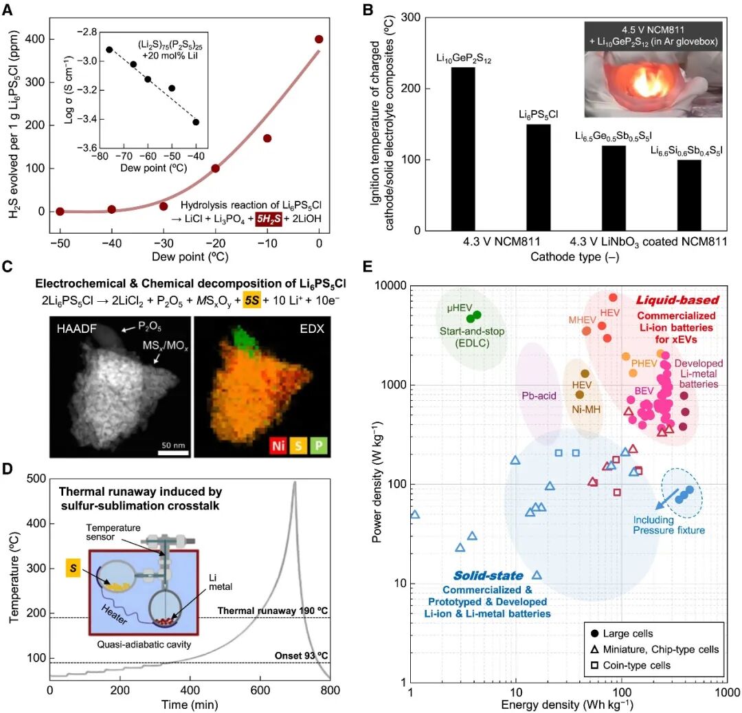 研究通過實(shí)驗(yàn)證明,硫化物固態(tài)電解質(zhì)遇濕氣會釋放劇毒H2S氣體(≥1000 ppm可致命),且其與富鎳正極材料(如NCM811)接觸后,在100°C以下即可引發(fā)自燃。此外,固態(tài)體系中鋰枝晶更易沿晶界生長,觸發(fā)短路和熱失控。對比液態(tài)電池(可通過隔膜與界面自修復(fù)抑制枝晶),固態(tài)系統(tǒng)的安全優(yōu)勢被過度夸大。圖中Ragone曲線進(jìn)一步顯示,目前全固態(tài)電池的實(shí)際能量/功率密度均落后于液態(tài)體系,且數(shù)據(jù)多來自微尺度電芯,難以反映大尺寸性能。