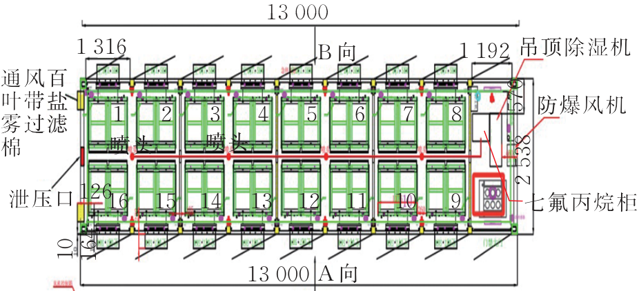 儲能電站設(shè)有消防給水系統(tǒng),建有5個地上式室外消火栓和1個216 m3的消防水池。每組電池預(yù)制艙設(shè)有火災(zāi)自動報警系統(tǒng)、七氟丙烷氣體滅火系統(tǒng)、可燃?xì)怏w探測器和防爆型通風(fēng)裝置。站內(nèi)設(shè)有消防控制室和水泵房,配備了滅火器材,設(shè)有環(huán)形消防車道。