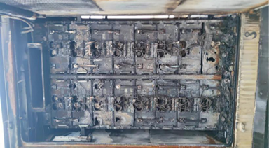 2號電池簇?zé)龘p程度較重,其他電池簇的燒損程度隨著與2號電池簇的距離依次減輕。2號電池簇各電池模組過火,外觀基本完好,燒損程度下重上輕,底部配電箱全部燒毀。6號PCS艙對應(yīng)1號、2號電池簇防雷裝置燒損,有過壓短路痕跡。2號電池簇及內(nèi)部電池模組燒損情況見圖4。