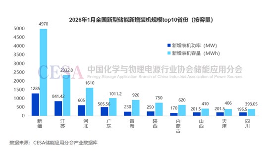 從各省份新增裝機(jī)規(guī)模來看,1月共有26省份新增投運(yùn)新型儲能項目,多個省份新增裝機(jī)規(guī)模達(dá)到GWh級別。