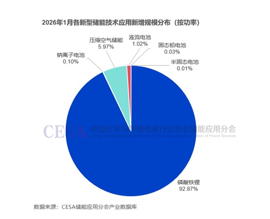 儲能技術(shù)路線方面,1月新增投運(yùn)儲能項目中,磷酸鐵鋰儲能技術(shù)并網(wǎng)總功率占比達(dá)92.87%,繼續(xù)保持主導(dǎo)地位。