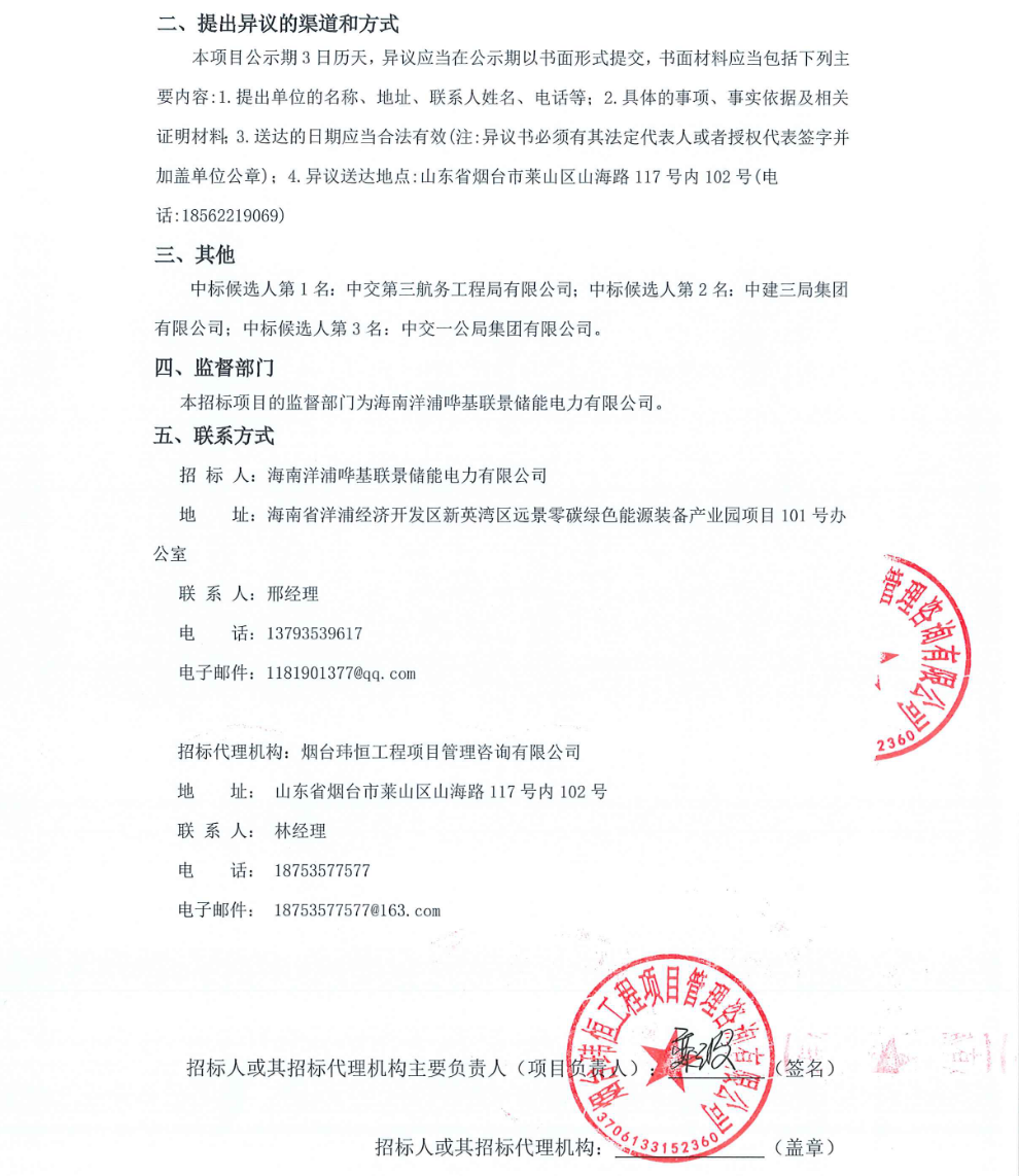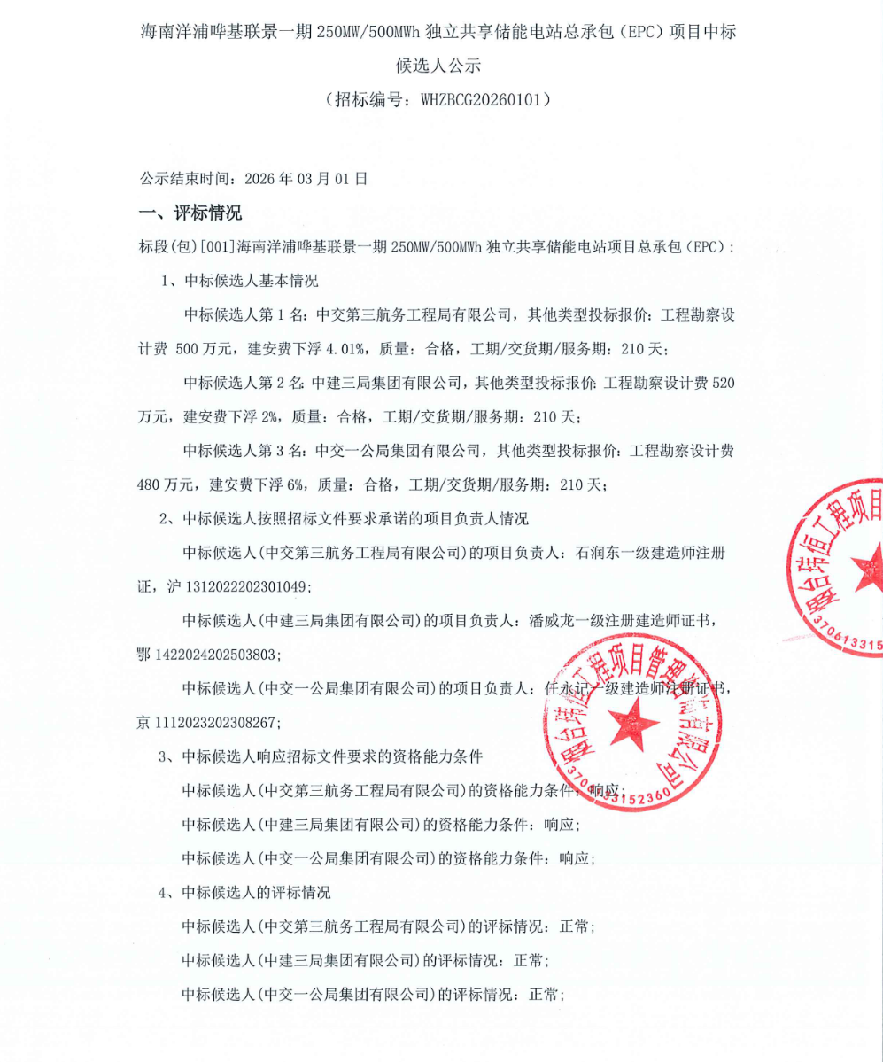 中國儲(chǔ)能網(wǎng)訊:2月26日,海南洋浦嘩基聯(lián)景一期250MW/500MWh獨(dú)立共享儲(chǔ)能電站總承包(EPC)項(xiàng)目中標(biāo)候選人公示。根據(jù)公示,中交第三航務(wù)工程局有限公司預(yù)中標(biāo)。