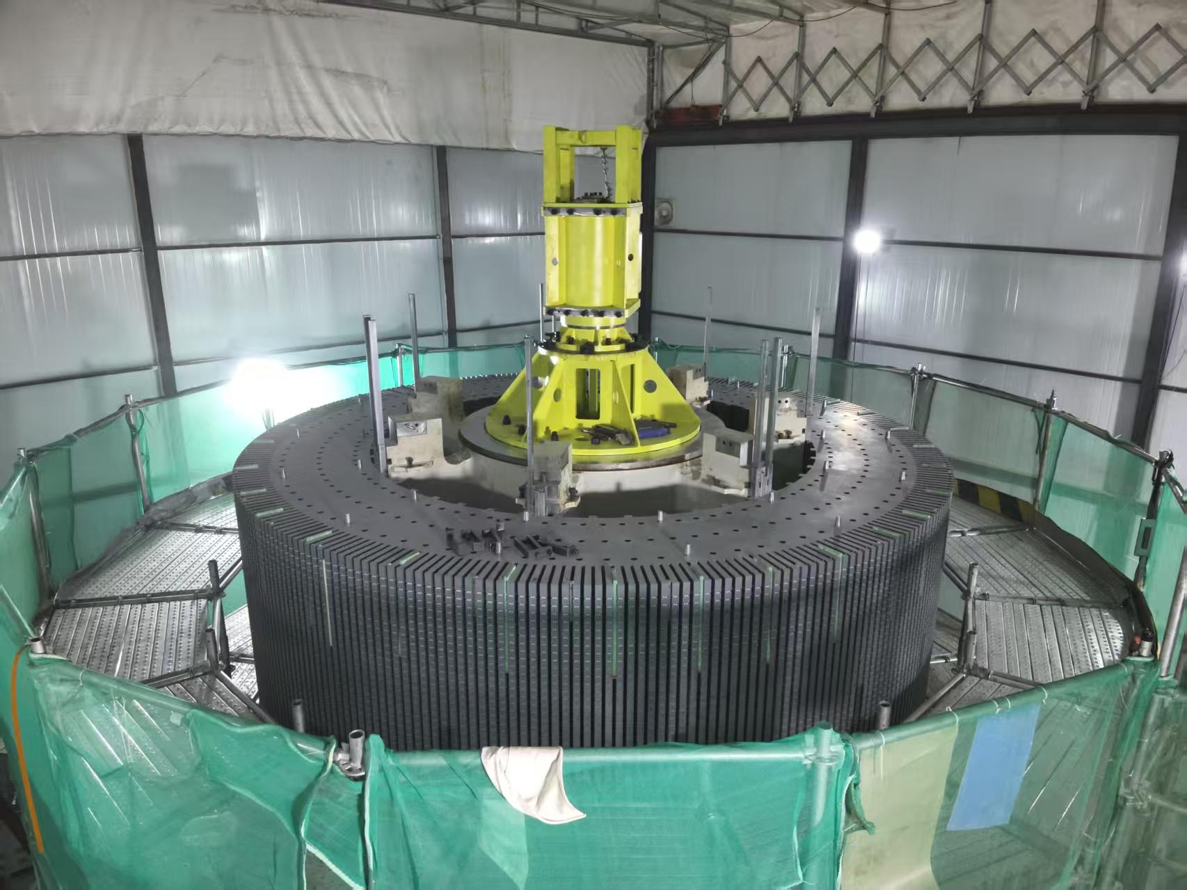 轉(zhuǎn)子鐵芯是變速抽蓄機(jī)組的關(guān)鍵部件,由6萬多片0.65毫米厚度的硅鋼片疊壓而成?!拔覀円韧ㄟ^加熱把轉(zhuǎn)子鐵芯壓緊牢固,再用切向鍵和徑向鍵把鐵芯和中心體鎖在一起,這對(duì)整個(gè)工藝管控要求非常高?!壁w磊指著高3.5米、直徑5米的機(jī)組轉(zhuǎn)子鐵芯說,“在自主研制過程中,我們堅(jiān)持正確的技術(shù)路線,通過嚴(yán)苛的實(shí)驗(yàn)論證、高質(zhì)量的生產(chǎn)制造,攻克了一系列技術(shù)難題?,F(xiàn)在進(jìn)入現(xiàn)場(chǎng)安裝的關(guān)鍵環(huán)節(jié),安裝質(zhì)量直接決定機(jī)組能否高效穩(wěn)定運(yùn)行,施工工藝與操作規(guī)范更是設(shè)備投用后性能達(dá)標(biāo)的關(guān)鍵,我們的工作容不得半點(diǎn)馬虎?!?/span>