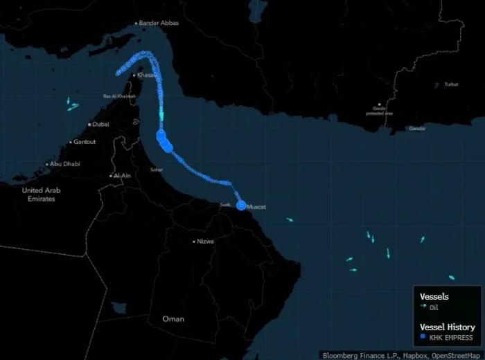 2月28日,KHK Empress號油輪在霍爾木茲海峽掉頭,而其他船只則在水道外等待。