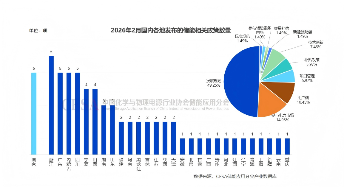 據(jù)CESA儲能應(yīng)用分會產(chǎn)業(yè)數(shù)據(jù)庫不完全統(tǒng)計,2026年2月份共發(fā)布儲能相關(guān)政策67項,國家層面發(fā)布5項,涉及發(fā)展規(guī)劃、參與電力市場、技術(shù)創(chuàng)新、標(biāo)準(zhǔn)規(guī)范等多個方面。