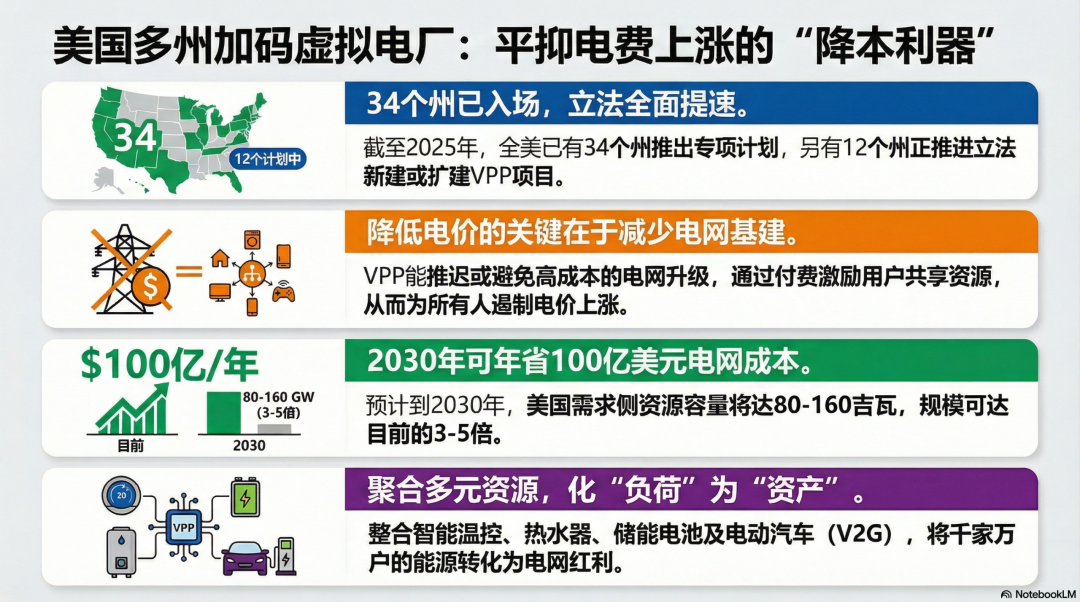 截至2025年,美國已有**34個州**推出專項計劃,要求電力企業(yè)整合智能溫控器、熱水器、儲能電池、電動汽車充電樁,以及工商業(yè)能源管理系統(tǒng)等用戶側資源,以此平抑不斷攀升的電價;
