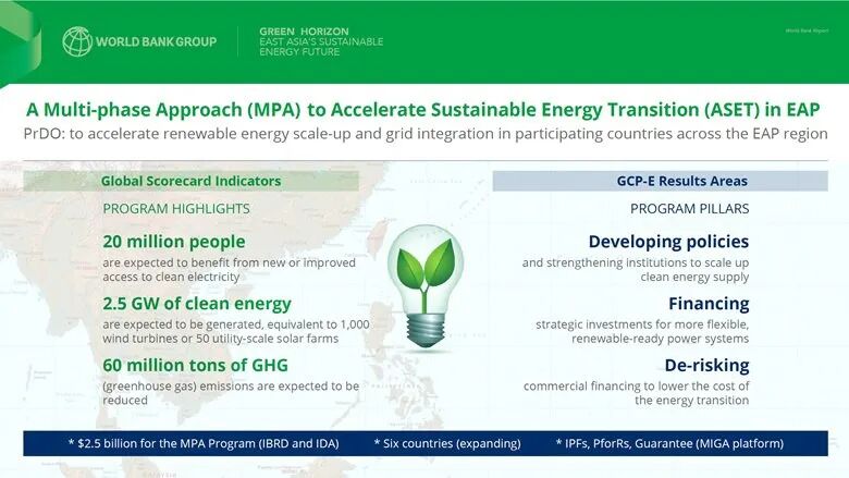 世界銀行集團(tuán)積極支持東亞地區(qū)將支點從雄心向?qū)嵤┺D(zhuǎn)移。25億美元投資的“東亞與太平洋地區(qū)加速可持續(xù)能源轉(zhuǎn)型計劃多階段程序化方法(MPA)”項目旨在取得實質(zhì)性成果:增加2000萬人的清潔電力供應(yīng),支持開發(fā)2.5吉瓦的清潔能源。作為對各國項目的補充,“東盟電網(wǎng)融資倡議”于2025年10月在東盟商務(wù)與投資峰會上與東盟和亞洲開發(fā)銀行共同啟動,以區(qū)域輸電與整合為目標(biāo)。