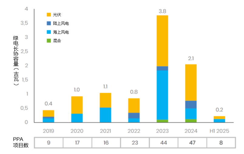 隨著負電價頻創(chuàng)新高、光伏市場價值持續(xù)走低,長期合同賴以維系的穩(wěn)定性基礎不斷動搖,整個市場陷入前所未有的高壓狀態(tài)。自2024年起,PPA新簽容量同比下降約40%;2025年上半年在此基礎上進一步下滑26%(見圖1)。其中,海上風電PPA受材料和融資成本上漲影響,成交量暴跌77%;光伏PPA也下降了近三成。