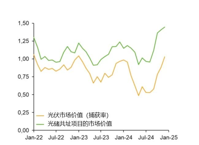 要從根本上提升光伏的市場價值,核心措施是借助電池儲能削峰填谷,重塑出力時間結構。據(jù)多家交易機構實證評估,光伏配儲的時間重構能力可將項目的平均捕獲價提升約30%(見圖2),顯著增強其長期市場價值。這不僅提升了項目自身的收益能力,也使長期合同的現(xiàn)金流結構更加穩(wěn)定,為PPA的重新定價奠定了可行基礎。