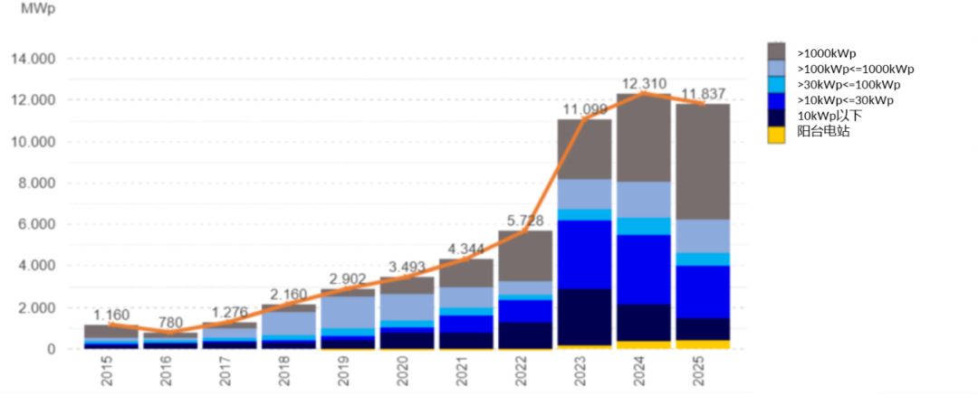 盡管PPA市場在過去兩年經(jīng)歷了斷崖式收縮,德國光伏新增裝機規(guī)模卻持續(xù)攀升,未見放緩。2025年,1000千瓦峰值以上的地面光伏項目甚至出現(xiàn)顯著增長(見圖4)。這一表象上的“背離”,實際上反映了能源轉(zhuǎn)型進程中的一次深層次調(diào)整:PPA的波動并非源于產(chǎn)業(yè)動能減弱,而是市場機制圍繞價格結構、風險分擔與資產(chǎn)調(diào)度正在經(jīng)歷系統(tǒng)性重構。