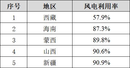 風(fēng)電利用率最低的五個省份分別為: