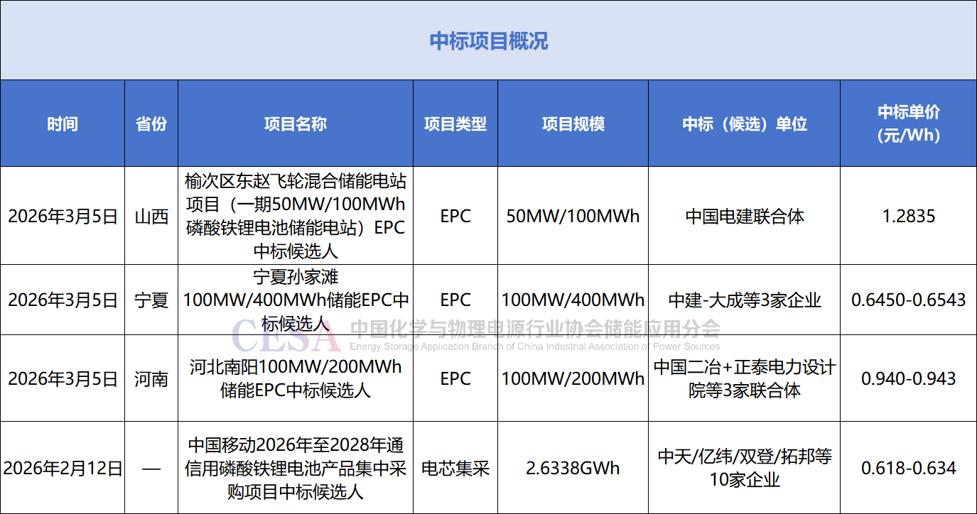 3月5日,吳忠市聚能科技有限公司孫家灘100MW/400MWh共享儲(chǔ)能電站建設(shè)項(xiàng)目(EPC總承包)中標(biāo)候選人公示,中建-大成擬中標(biāo)2.58億元,折合單價(jià)約0.6450元/Wh。