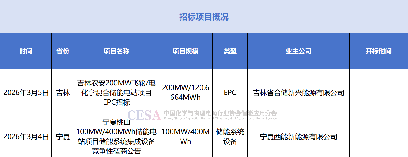 招標(biāo)方面,3月4日,寧夏桃山100MW/400MWh儲(chǔ)能電站項(xiàng)目發(fā)布儲(chǔ)能系統(tǒng)集成設(shè)備競(jìng)爭性磋商公告,進(jìn)行二次招標(biāo);3月5日,吉林省農(nóng)安縣200MW飛輪/電化學(xué)混合儲(chǔ)能電站項(xiàng)目EPC發(fā)布招標(biāo)公告。