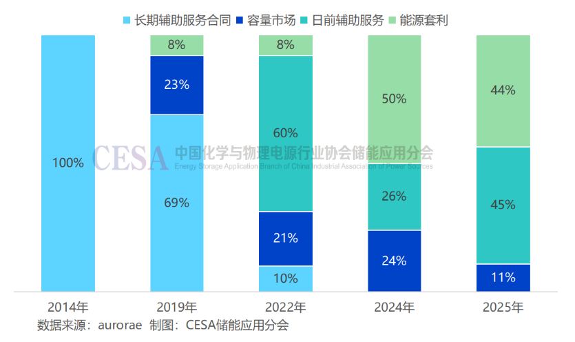 當前,英國儲能收入結構正經(jīng)歷深刻轉(zhuǎn)型:以頻率響應為代表的傳統(tǒng)輔助服務收益占比持續(xù)下滑,而能源套利與平衡機制收入快速上升,逐步成為項目收益的核心支柱。