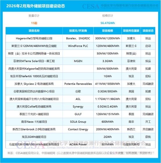 中國儲能網(wǎng)訊:2026年2月,CESA儲能應用分會產業(yè)數(shù)據(jù)庫追蹤到15起海外儲能項目建設動態(tài)事件,總規(guī)模為56.47GWh,涉及Boralex、SNGRDC、WindForce PLC、MGEN、Potentia Renewables、谷歌、ASL、Synergy、GULF、SOLA Group、Contact Energy、ACWA Power等全球能源投資方/開發(fā)商,建設地點位于澳大利亞、菲律賓、剛果(金)、美國、南非、斯里蘭卡、泰國、烏茲別克斯坦、新西蘭、埃及、加拿大等國家。