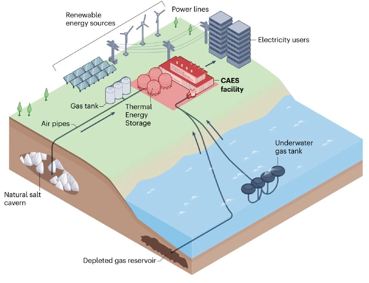 在全球加速推進(jìn)能源低碳轉(zhuǎn)型背景下,可再生能源規(guī)模持續(xù)增長,但其間歇性和波動性對電力系統(tǒng)提出很大挑戰(zhàn),儲能技術(shù)成為解決上述問題的主要途徑。壓縮空氣儲能(CAES)(如圖1)具有容量大、壽命長、成本低、環(huán)境友好等優(yōu)勢,被視為最具潛力的長時儲能路線之一。最近二十年來,壓縮空氣儲能技術(shù)得到了快速發(fā)展,出現(xiàn)了多種技術(shù)路線,工程示范項(xiàng)目也快速增加,但缺乏從基礎(chǔ)研究到工程示范、從關(guān)鍵部件到系統(tǒng)集成的系統(tǒng)性、綜合性和方向性分析。