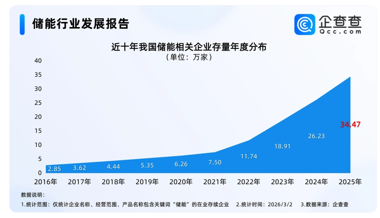 企查查數(shù)據(jù)顯示,2021年開始,我國儲(chǔ)能相關(guān)企業(yè)存量增速加快,次年首次突破10萬家,達(dá)11.74萬家,截至2025年年底,我國在業(yè)存續(xù)34.47萬家儲(chǔ)能相關(guān)企業(yè);截至3月2日,我國現(xiàn)存35.5萬家儲(chǔ)能相關(guān)企業(yè)。
