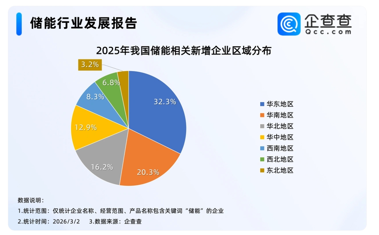企查查數(shù)據(jù)顯示,2025年新注冊的10.7萬家儲(chǔ)能相關(guān)企業(yè)中,超三成位于華東地區(qū),占比32.3%,其次是華南地區(qū),占比20.3%,東北地區(qū)相對最少,占比3.2%。