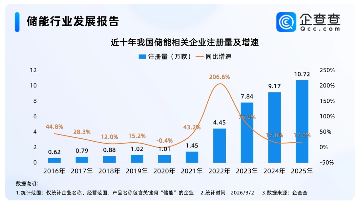 企查查數(shù)據(jù)顯示,近十年,我國儲(chǔ)能相關(guān)企業(yè)每年注冊量基本逐年增加,尤其是2022年,全年注冊量同比激增206.6%至4.45萬家,達(dá)近十年注冊量增速峰值,2025年全年,我國儲(chǔ)能相關(guān)企業(yè)注冊量同比增加17.0%至10.72萬家,創(chuàng)近十年儲(chǔ)能相關(guān)企業(yè)年度注冊量新高。截至3月2日,2026年我國已注冊1.44萬家儲(chǔ)能相關(guān)企業(yè).