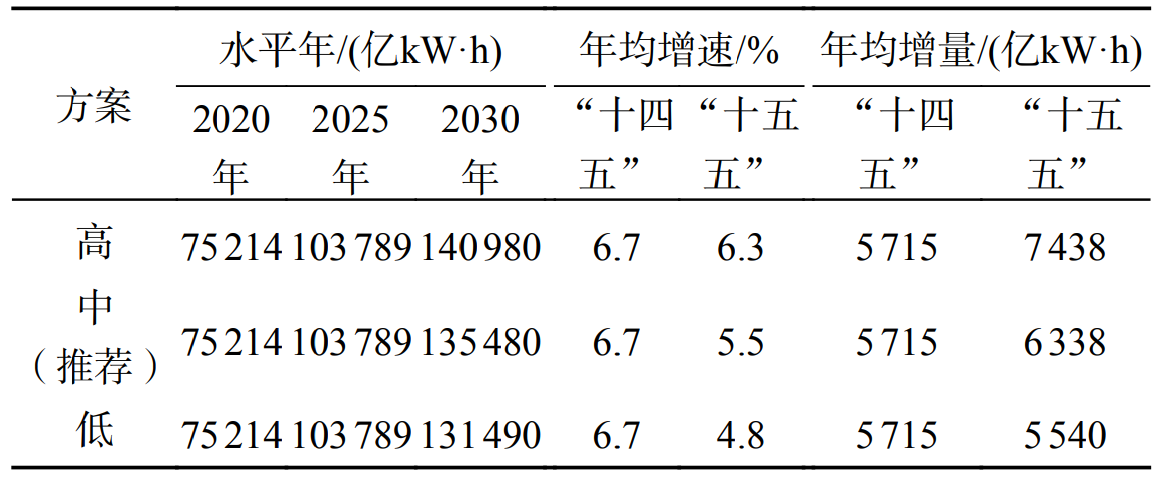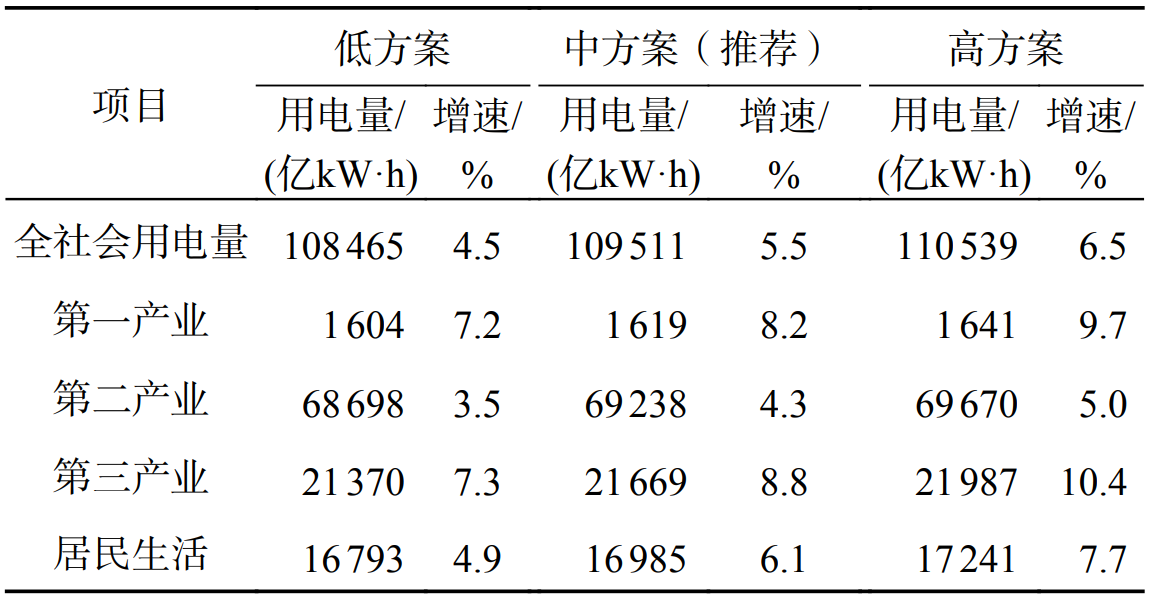 3)低方案。在“中方案”基礎(chǔ)上,考慮國(guó)際政治經(jīng)濟(jì)形勢(shì)不確定性加劇、國(guó)內(nèi)新興高電耗產(chǎn)業(yè)發(fā)展不及預(yù)期等影響。
