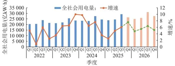 分季度看,預(yù)計(jì)2026年4個(gè)季度全社會(huì)用電量增速分別為4.8%、5.5%、6.4%和5.2%,第三季度受度夏高溫天氣拉動(dòng),用電增速預(yù)計(jì)為年內(nèi)最高。各季度用電量走勢(shì)如圖2所示。