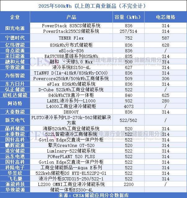 據(jù)CESA儲(chǔ)能應(yīng)用分會(huì)不完全統(tǒng)計(jì),2025年工商儲(chǔ)領(lǐng)域推出的188個(gè)新產(chǎn)品中,配置314Ah電芯的產(chǎn)品共有97個(gè),配置500+電芯的共有3個(gè)。