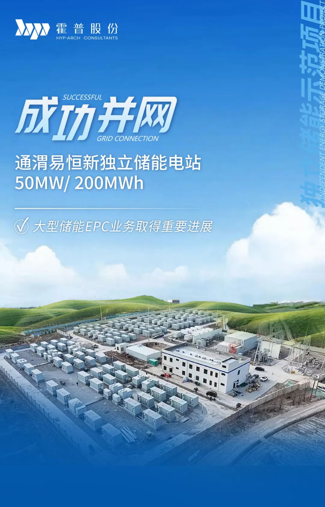 近日,由上海霍普建筑設(shè)計(jì)事務(wù)所股份有限公司(以下簡稱“霍普股份”) 全資子公司天津嘉暉電力工程有限公司牽頭實(shí)施的通渭易恒新50MW/200MWh獨(dú)立儲(chǔ)能電站示范項(xiàng)目EPC總承包工程順利實(shí)現(xiàn)并網(wǎng)運(yùn)行,項(xiàng)目正式進(jìn)入運(yùn)營階段。