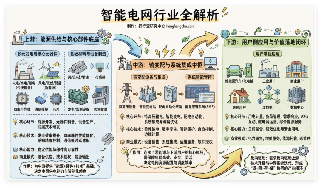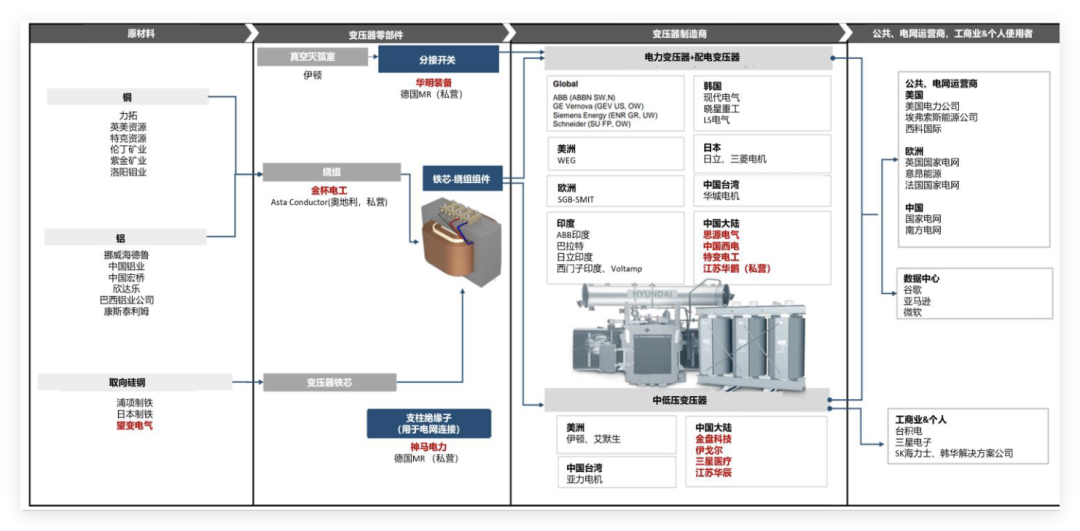 變壓器產(chǎn)業(yè)鏈上游包括硅鋼片、有色金屬及絕緣材料等關(guān)鍵原料;中游涵蓋設(shè)計、生產(chǎn)及測試環(huán)節(jié),電力/配電/特種變壓器等產(chǎn)品通過技術(shù)升級與規(guī)模擴(kuò)張構(gòu)建競爭力;下游覆蓋電網(wǎng)、新能源、軌道交通、數(shù)據(jù)中心等多元場景,當(dāng)前下游需求升級驅(qū)動產(chǎn)品向智能定制化和高效節(jié)能方向迭代,形成全鏈條產(chǎn)業(yè)閉環(huán)。