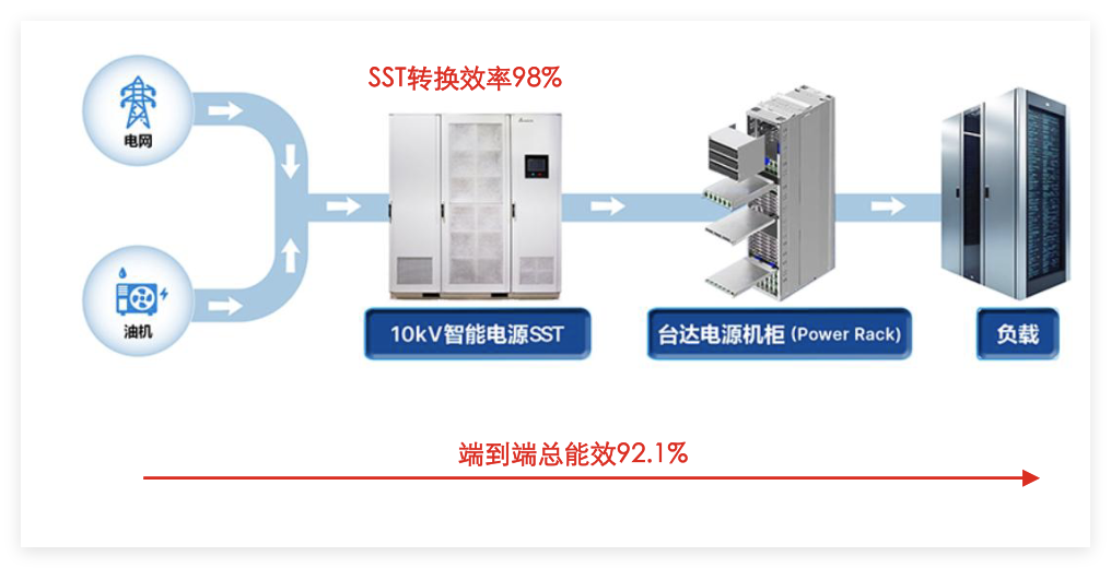 根據(jù)臺達(dá),傳統(tǒng)供電 架構(gòu)端到端總能效為89.1%,使用SST后端到端效率可提升至92.1%。