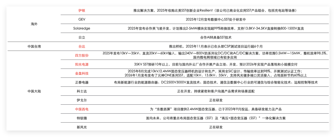 中國大陸廠商四方股份全球首臺全碳化硅SST已在示范項目中應(yīng)用,效率較傳統(tǒng)變壓器提升2%以上;新特電氣與維諦合作開發(fā)高頻變壓器,應(yīng)用于數(shù)據(jù)中心電源系統(tǒng),體積較傳統(tǒng)產(chǎn)品縮小50%;伊戈爾作為光伏和儲能升壓變出海龍頭,在SST領(lǐng)域也有所布局。