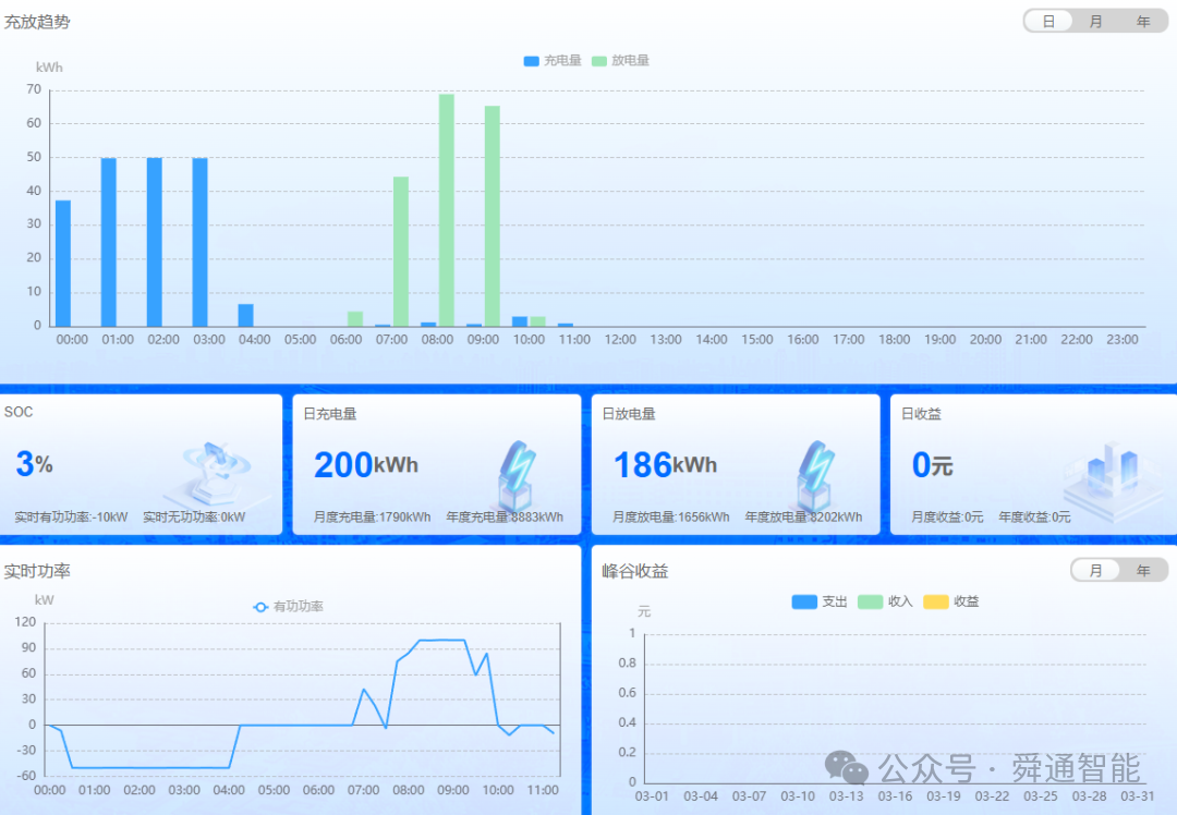 儲能監(jiān)測:對 430kWh 磷酸鐵鋰儲能系統(tǒng)實現(xiàn)多維度精細化監(jiān)測,實時監(jiān)控儲能 SOC、SOH、充放電狀態(tài)、充放電功率及累計充放電量,采集儲能變流器(PCS)交直流側電壓、電流、功率及電池管理系統(tǒng)(BMS)的單體電池電壓、溫度。同時監(jiān)測儲能設備環(huán)境溫度、消防狀態(tài)、空調(diào)運行情況,統(tǒng)計儲能充放電記錄、峰谷套利收益及儲能效率,支持充放電歷史曲線查看,預警電池過充、過放、溫度異常及 PCS 通訊故障等問題,保障儲能系統(tǒng)安全可靠運行。