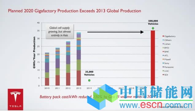 在特斯拉從首款車型Roadster向目前的Model S 轉(zhuǎn)型的4年時間里,電池組成本已經(jīng)下降了約44%,并且會繼續(xù)下降。特斯拉全球最大的Gigafactory(千兆工廠)將在2017量產(chǎn),到2020年Gigafactory的鋰電池產(chǎn)量將會超過2013年全世界的鋰電池產(chǎn)量之和。每千瓦時的電池組的成本將會降低30%以上。
