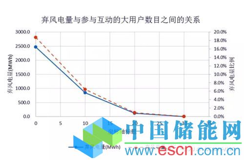 在沒有大用戶參與互動時, 僅靠常規(guī)機組進行調(diào)峰, 該典型日無法全額消納新能源, 棄風電量比例達到了18.7%, 棄風總電量2470 MW?h。隨著參與互動的大用戶數(shù)目增多, 棄風電量和棄風電量比例都呈遞減趨勢; 最終, 30個大用戶參與互動時, 實現(xiàn)了新能源的全額消納。