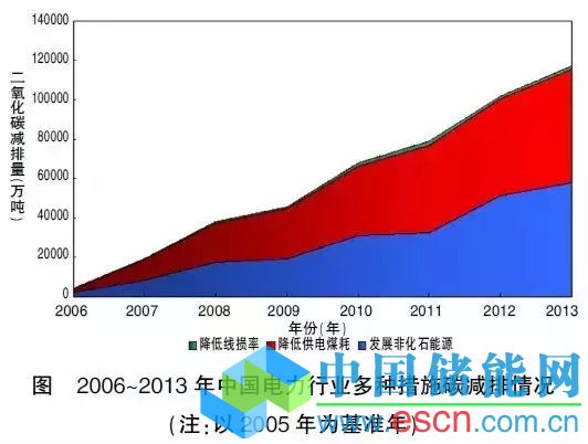 電廠二氧化碳捕集、利用、埋存的試點取得了成功經(jīng)驗。燃煤或燃氣電廠煙氣中的二氧化碳捕集能力為3000噸/年到12萬噸/年的幾個試點項目在運行;二氧化碳埋存的地質(zhì)調(diào)查也做了大量工作;基于工程項目的燃煤電廠富氧燃燒捕集二氧化碳的國際合作研究有效開展。中國通過發(fā)展非化石能源、降低煤耗和線損率等措施,以2005年為基準(zhǔn)年,2006~2014年,累計減排二氧化碳約60億噸,2014年單位發(fā)電量二氧化碳排放量比2005年降低了19%。根據(jù)作者的相關(guān)研究,電力二氧化碳減排的貢獻見下圖。